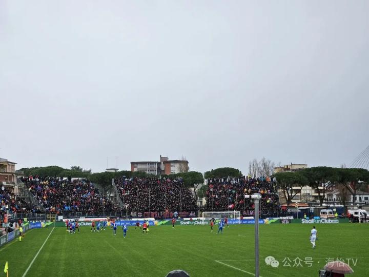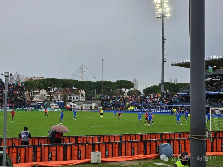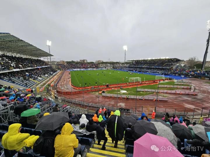 从视野上看,这里也很难说得上好,由于这座球场属于体育场,场地距离看台有非常宽的跑道,球门后侧的看台距离球场的距离只会更远,甚至在这里,相比于球场,看身后训练场的视野似乎更好一些。而且在这时候雨势开始增大,冬季意大利风雨交加的午后让我的手脚格外冰冷。