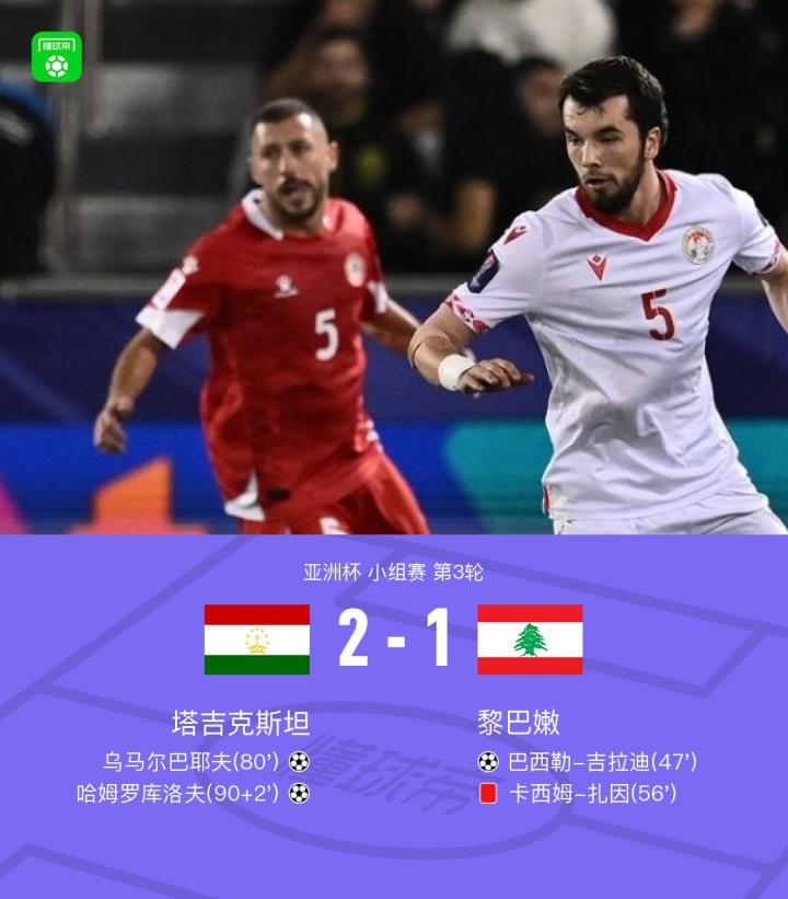 北京时间1月22日亚洲杯 小组赛 第3轮,塔吉克斯坦对阵黎巴嫩。下半场巴西勒-吉拉迪世界波破门,随后卡西姆扎因犯规染红,黎巴嫩以10人应战,之后乌马尔巴耶夫任意球破门扳平比分,补时阶段哈姆罗库洛夫头球破门帮助塔吉克斯坦完成逆转。最终塔吉克斯坦2-1逆转十人黎巴嫩成功出线,黎巴嫩垫底出局。