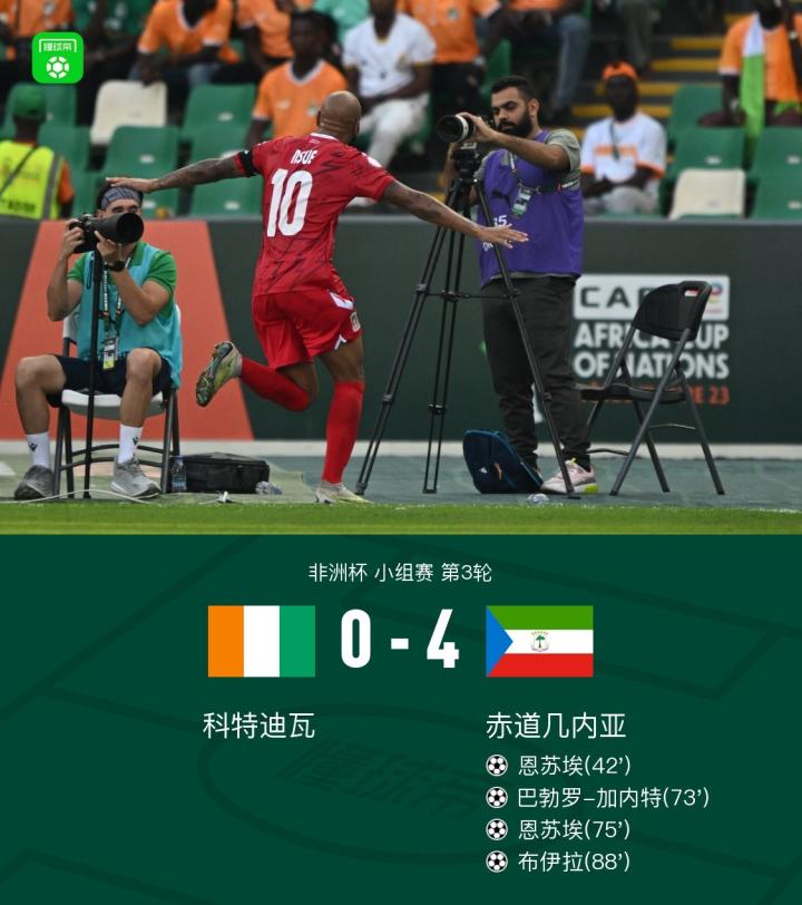 赤道几内亚4-0大胜科特迪瓦以小组头名出线,恩苏埃双响