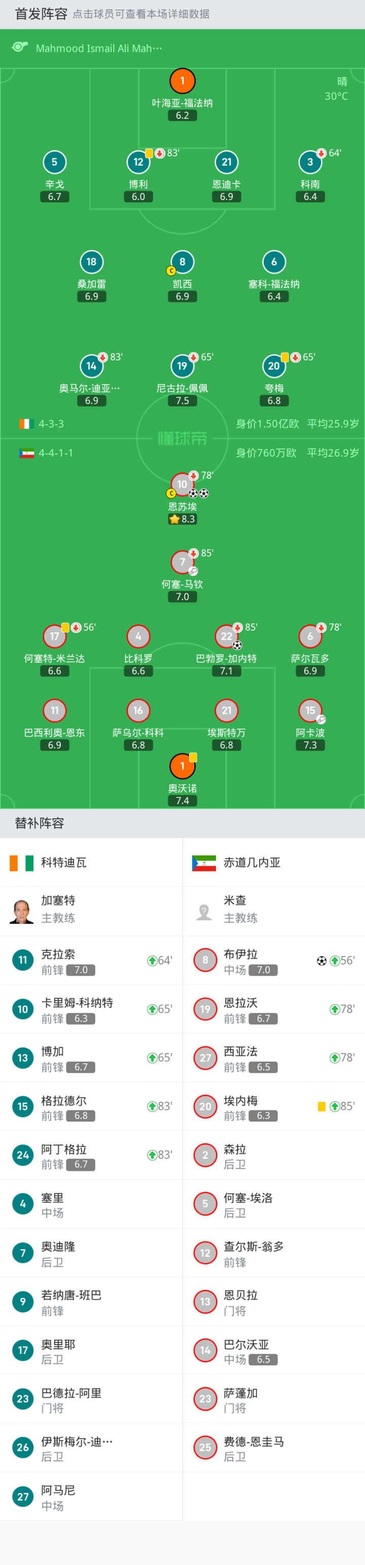 替换下场:83'12-博利, 65'19-尼古拉-佩佩, 65'20-夸梅, 64'3-科南, 83'14-奥马尔-迪亚基特