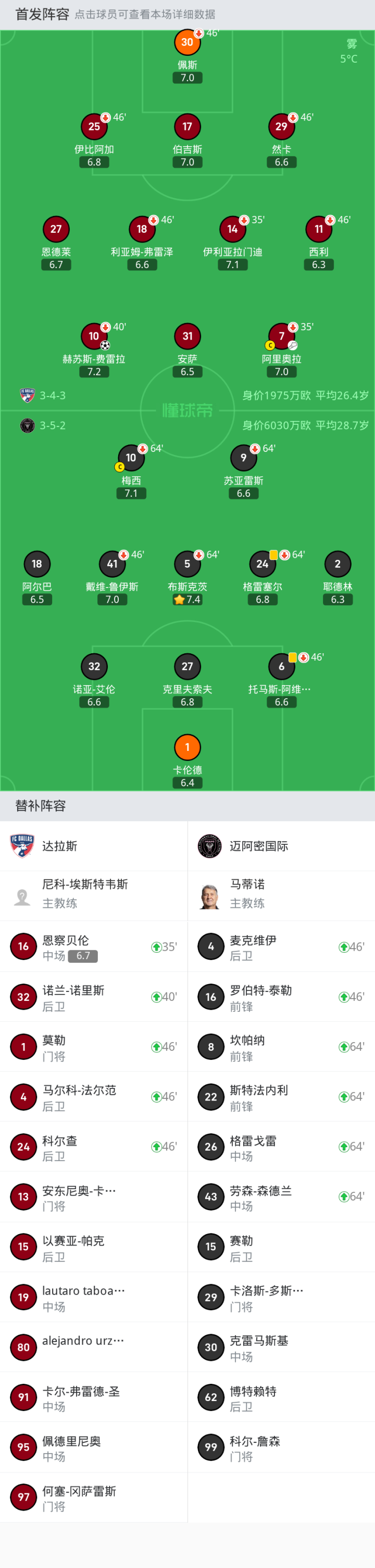 第3分钟,费雷拉开场3分钟禁区低射破门,达拉斯1-0领先迈阿密国际