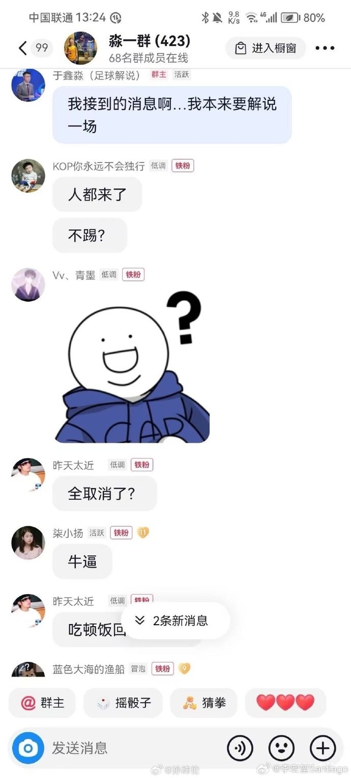 解说员于鑫淼在个人粉丝群暗示,接到消息比赛可能要延期或取消。