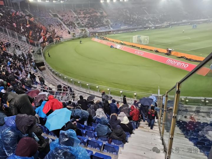 相比之下,球场内部的维护还是不错的,虽然所有人都知道场地周围是有一圈跑道的,但在跑道上“种草”后,看台与球场的距离感似乎减少了一些。球场最具特色的钟楼位于我的右侧,但由于需要将购买不同票价的球迷区分开,右侧有一个巨大的玻璃挡板,这个挡板不仅阻止球迷穿过,还很隔音,有两个互相认识的小球迷在挡板两侧偶遇,却只能大声说话才能让对方听见。