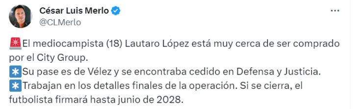 据TyC的信息显示,城市集团一直关注来自阿根廷出色的青年才俊,包括来自河床的阿尔瓦雷斯、或者即将公布的埃切维里,这次他们把目标定为了萨斯菲尔德的18岁小将劳塔罗-洛佩斯Lautaro López 。