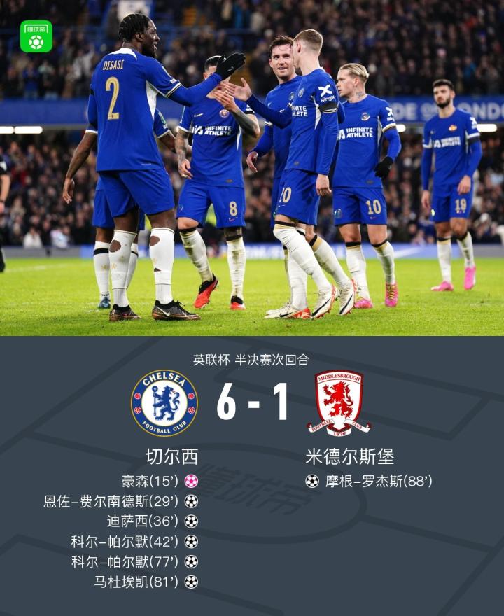 北京时间1月24日英联杯 半决赛次回合,切尔西主场对阵米德尔斯堡。斯特林分球给布罗亚,后者射门导致豪森乌龙为切尔西首开记录。随后布罗亚射门被防守球员挡出,恩佐门前机敏补射破门将总比分反超。半场结束前,迪萨西和帕尔默各入一球将比分改写为4-0。下半场帕尔默上演梅开二度,马杜埃也打进一球锁定胜局。比赛尾声阶段,罗杰斯内切后兜射破门为米德尔斯堡扳回一城。最终切尔西主场6-1狂胜米德尔斯堡,总比分6-2晋级英联杯决赛。