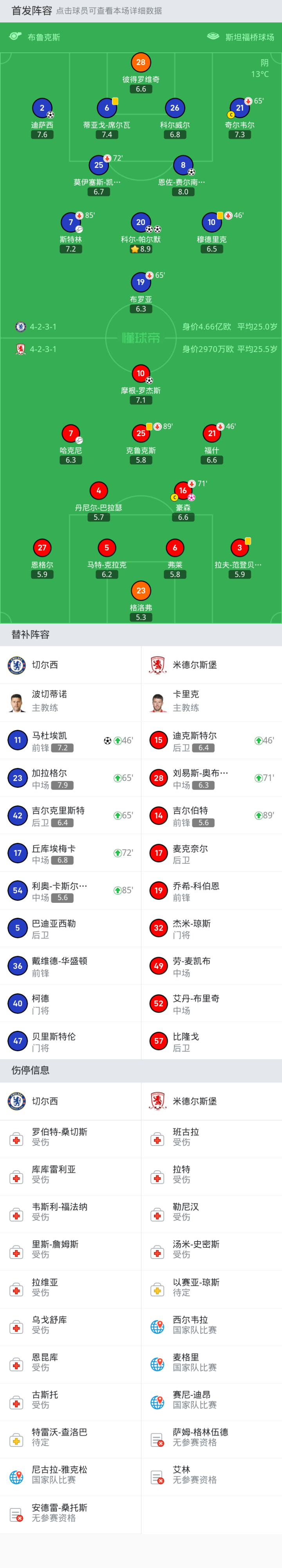 替换下场:85'7-斯特林, 65'21-奇尔韦尔, 46'10-穆德里克, 65'19-布罗亚, 72'25-莫伊塞斯-凯塞多