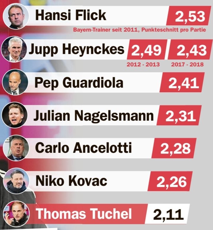 在上一轮德甲比赛中,拜仁主场0-1不敌不莱梅,遭遇了本赛季各项赛事的第4场失利。拜仁主帅图赫尔最近受到质疑。慕尼黑当地媒体《慕尼黑日报》列出了拜仁从2011年以来历任主教练的场均积分情况,其中弗里克的场均积分最高,而图赫尔是其中最低的。