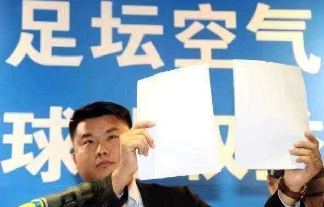 2015年10月29日,大连球迷协会新闻发布会现场,康波在展示相关举报材料。