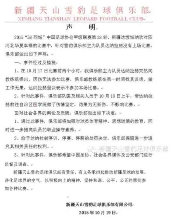 2015年10月19日,新疆天山雪豹俱乐部发布声明:俱乐部队医及相关人员于10月18日上午,带达纳拉赫前往自治区医学院做了伤情鉴定,结果为无新伤、不影响比赛。声明最后,天山雪豹公布了对达纳拉赫的处罚:停训、停赛、停薪。
