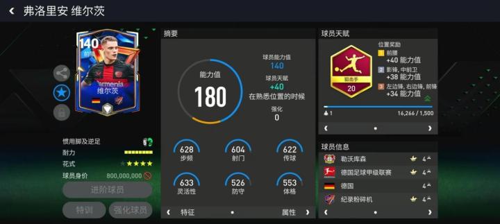 创始俱乐部活动推出的这张140版本维尔茨配备了狙击手天赋,进一步强化了他的传球与灵活性两项属性,维尔茨的数据面板是顶尖的前场策应轴心。