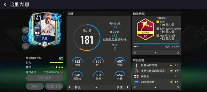 赛季最佳版本的这张凯恩基础能力值给到了141,各项进攻数据都在650左右,搭配强力锋霸天赋之后,射门能力得到了进一步提升,至今仍有一战之力!