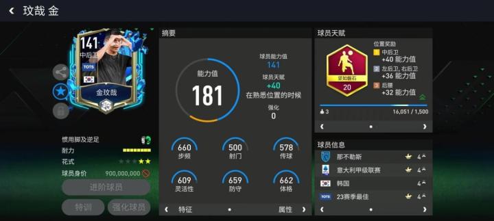 赛季最佳版本的金玟哉配备了坚如磐石天赋,防守数据与双速都得到了加强,其数据面板堪称是完美中卫的模型,实用价值极高。