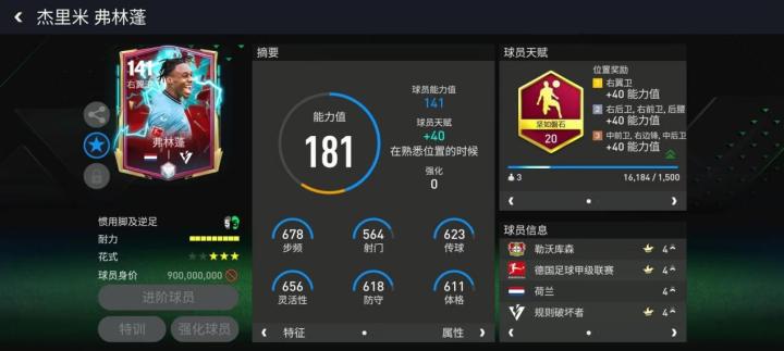 规则破坏者弗林蓬基础能力值给到了141,他本身双速与灵活性数据就极为突出,搭配坚如磐石天赋后,防守与传球能力也得到了加强,他的数据面板配置几乎没有短板。