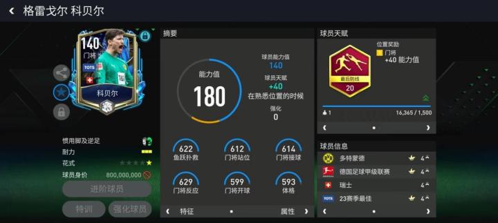 赛季最佳科贝尔基础能力值给到了140,配备最后防线天赋,鱼跃扑救与门将反应能力都得到了提升,他本身的接球能力就很强,天赋加成之后各项门线技术都在600以上,实战价值极高。