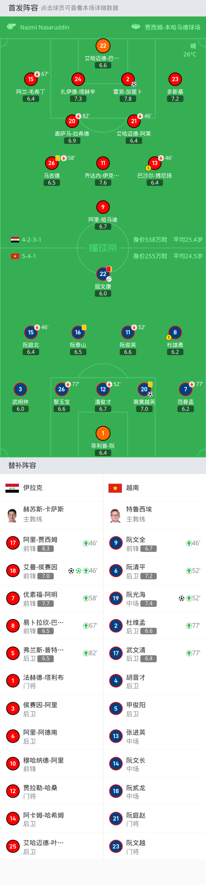 伊拉克首发:20-奥萨马-拉希德, 2-雷宾-加里卜, 13-巴沙尔-博尼扬, 15-阿兰-毛希丁, 21-艾哈迈德-阿莱, 22-艾哈迈德-巴西勒, 9-阿里-哈马迪, 11-齐达内-伊克巴尔, 23-多斯基, 26-马吉德, 24-扎伊德-塔赫辛