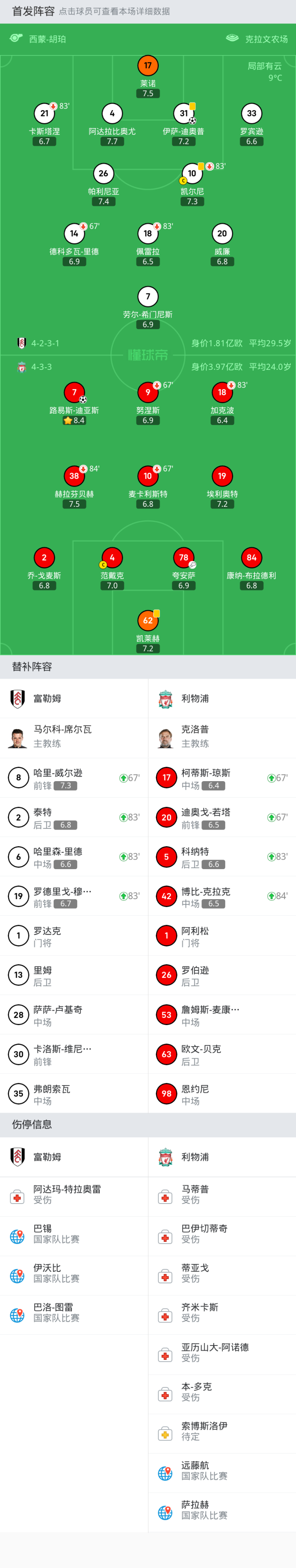 富勒姆首发:20-威廉, 10-凯尔尼, 17-莱诺, 14-德科多瓦-里德, 7-劳尔-希门尼斯, 18-佩雷拉, 26-帕利尼亚, 21-卡斯塔涅, 4-阿达拉比奥尤, 31-伊萨-迪奥普, 33-罗宾逊