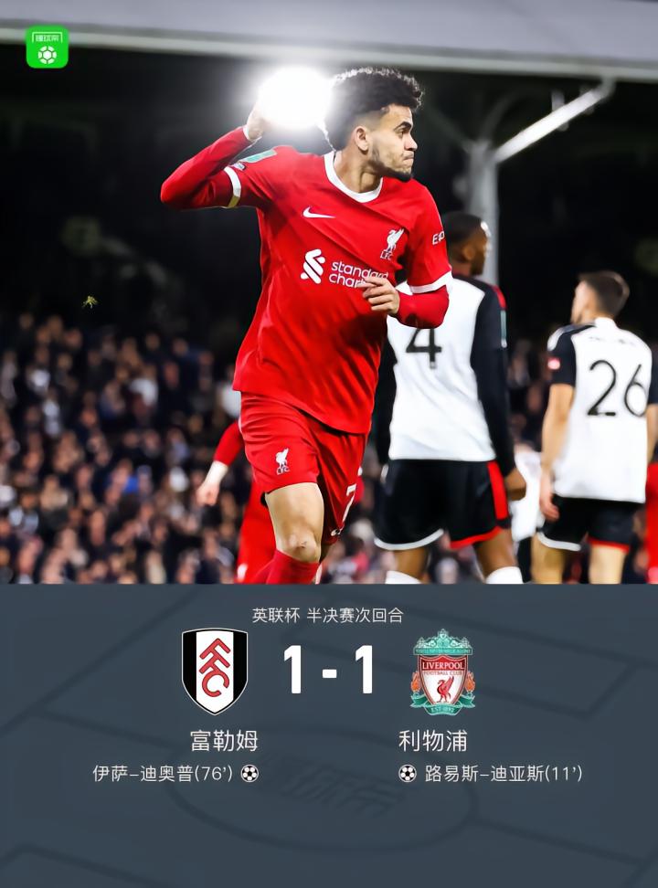红军总分3-2富勒姆晋级英联杯决赛,迪亚斯破门,夸安萨助攻