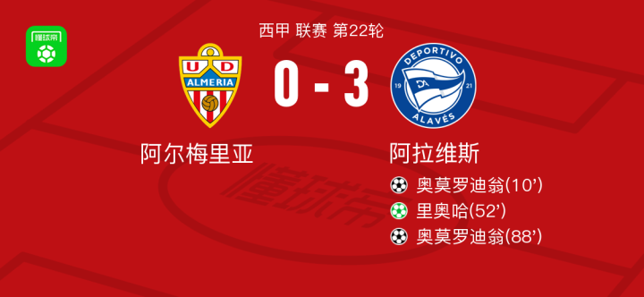北京时间1月27日西甲 联赛 第22轮,阿尔梅里亚主场对阵阿拉维斯。阿尔梅里亚。阿拉维斯奥莫罗迪翁梅开二度,里奥哈破门。最终比分0-3。