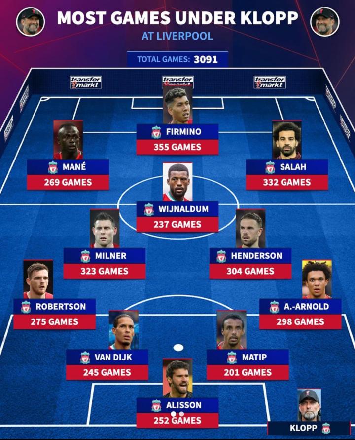 在渣叔手下效力参加比赛最多的利物浦球员阵容: