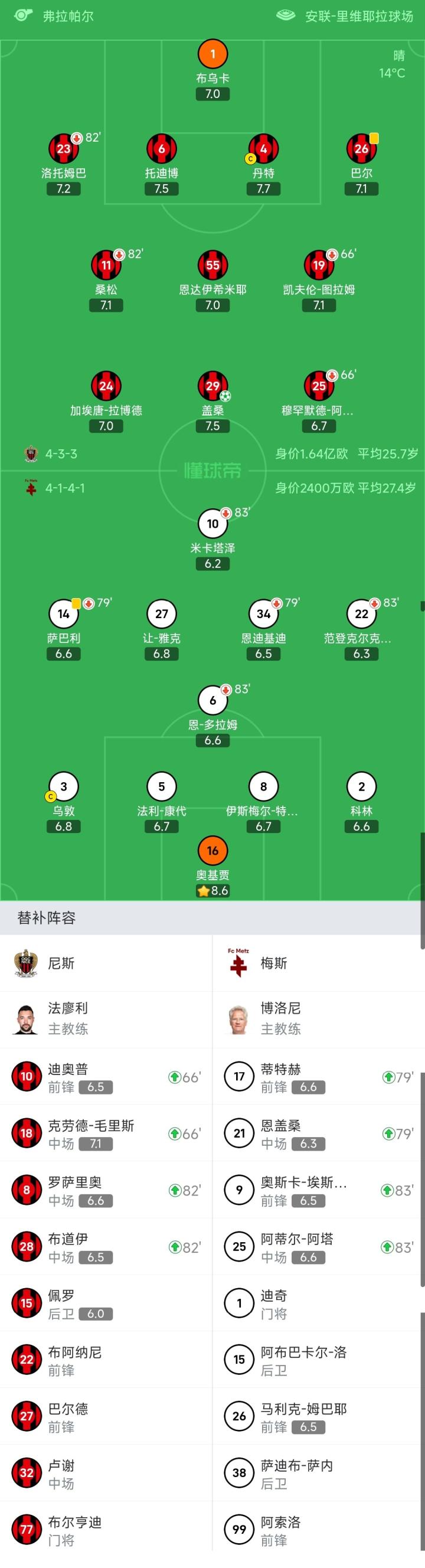 梅斯首发:8-伊斯梅尔-特拉奥雷, 16-奥基贾, 2-科林, 3-乌敦, 6-恩-多拉姆, 22-范登克尔克霍夫, 5-法利-康代, 14-萨巴利, 27-让-雅克, 10-米卡塔泽, 34-恩迪基迪
