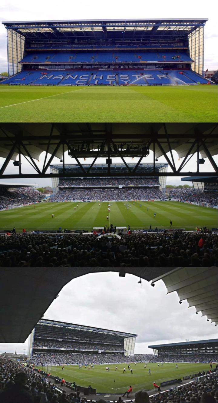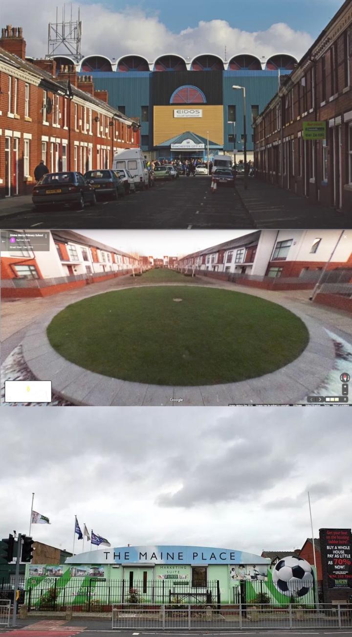 【曼城曾经的主场缅因路球场:默默守护蓝月的80年峥嵘岁月】 在2003年搬至城市球场(后获赞助商冠名伊蒂哈德球场)以前,曼城的主场位于缅因路球场(Maine Road),如今已经被拆除。 标志性的缅因路球场自1923年在工人阶级、多民族的摩斯城社区建成以来,已经以曼城的主场在80年的时间里完成了1753场比赛。这座建于旧砖块工厂故址的球场,在曼城决定搬出旧的海德路球场之后,在他们搬进超现代的伊蒂哈德球场之前,一直都是曼城的主场。这是一个巨大的球场,能够容纳约8万名观众,因此获得了“北方温布利”的称号。缅因路也曾是曼联的主场,从1946年到1949年,当时二战中德国的轰炸严重破坏了老特拉福德球场。除了承办足球赛事,The Rolling Stones、Pink Floyd、Queen、David Bowie等乐队都在缅因路球场办过演出,自然也包括Oasis。 在缅因路,曼城俱乐部也在不断翻修这座球场。在这段时光里,曼城不断降级又不断重回英超,而缅因路球场总是很顽强。但是最后因为球场老旧、位置不足、安全隐患等多种原因被放弃了。而中国球员孙继海加盟曼城的首个赛季就是缅因路球场服役的最后一季。 02/03赛季结束后,曼城迁到了城市球场(即现在的伊蒂哈德球场),缅因路球场被拆除。值得一提的是,曼城更换主场的一个重要原因,就是缅因路球场处于曼彻斯特的贫民区,影响到曼城俱乐部的竞争力。现在,缅因路球场的旧址上,是一个住宅小区。曼城迁到伊蒂哈德球场之后,签下的租约是250年。 “在这里,我已忘记属于自己的爱”。伴随着队歌《蓝月亮》的最后一句歌词,曼城离开了缅因路球场,这座拥有80年历史的球场也就此载入俱乐部历史。