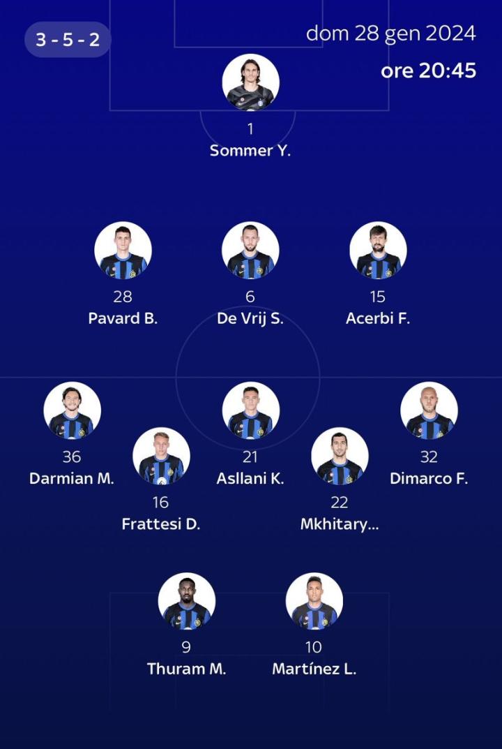 意大利天空体育认为,此战巴斯托尼将会继续休战,此外与俱乐部在续约问题上存在分歧,近3场比赛0出场的邓弗里斯也会继续担任替补,中场巴雷拉和恰尔汗奥卢轮休,弗拉泰西和阿斯拉尼出战,锋线上依然是劳塔罗搭档马库斯-图拉姆。