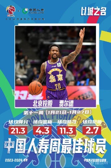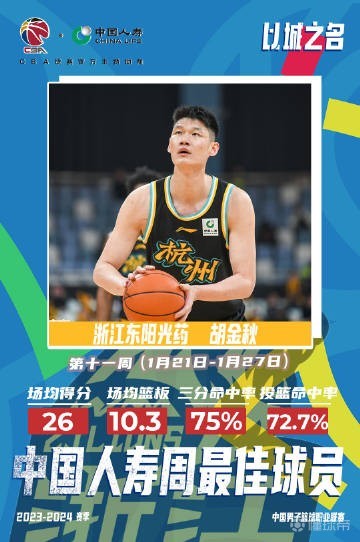 北京时间1月28日,CBA官方宣布:广厦队胡金秋、北控队费尔德当选第11周最佳球员。