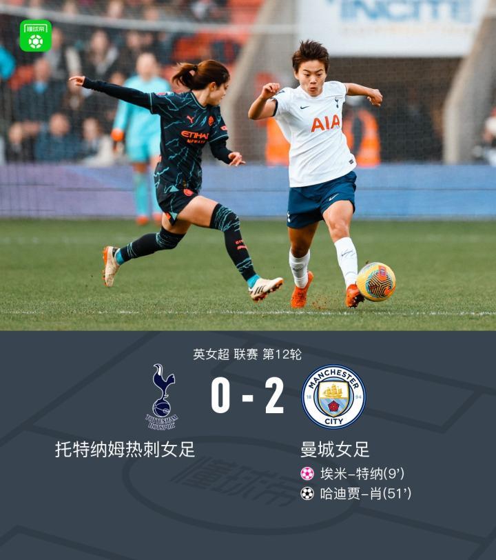 北京时间1月28日英女超 联赛 第12轮,托特纳姆热刺女足主场对阵曼城女足。托特纳姆热刺女足埃米-特纳自摆乌龙。曼城女足哈迪贾-肖破门,第63分钟,王霜替补登场上演自己的联赛首秀。最终热刺女足0-2不敌曼城女足。