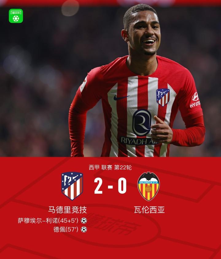 马竞2-0瓦伦西亚取4连胜,利诺建功,德佩连场破门