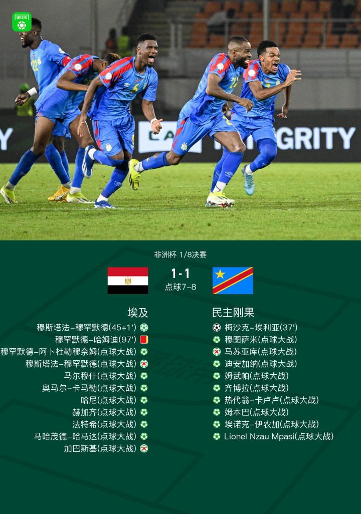 北京时间1月29日非洲杯 1/8决赛,埃及主场对阵民主刚果。上半场埃利亚头球破门,穆斯塔法扳平,下半场两队均无建树,加时赛两队均未进球,点球大战最终民主刚果8-7获胜,总比分9-8晋级。