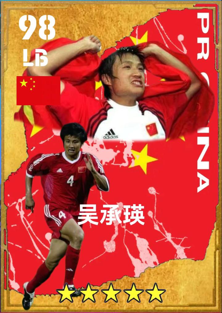 实况最强国足-自制传奇卡——第四弹 李玮峰:他曾经是米卢最中意的弟子之一,22岁随队出征2000亚洲杯,并且一举坐稳国足主力中后卫位置。23岁在十强赛表现完美,将带刀后卫本色发挥的淋漓尽致。在客场对阵卡塔尔比赛中,攻入关键进球,帮助我们拿到宝贵一分。在主场头球2-0战胜乌兹别克斯坦,助力完成我们盼了44年的世界杯梦。 吴承瑛:国足历史上最强的左边后卫,突破技术速度射门传中脚法无人能出其右。抢断凶狠果断,防守干净利落,他就是拼命三郎—吴承瑛。