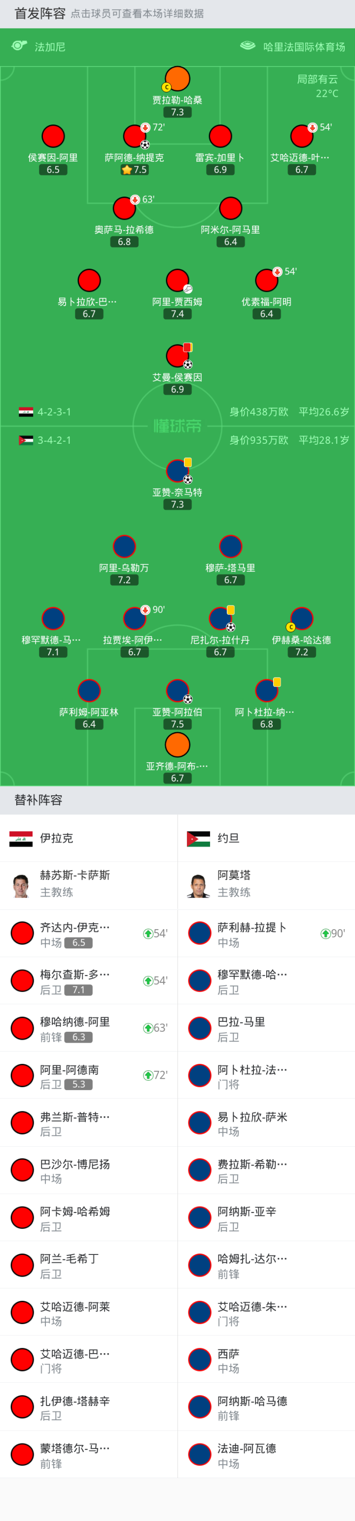 替换下场:63'20-奥萨马-拉希德, 72'4-萨阿德-纳提克, 54'7-优素福-阿明, 54'25-艾哈迈德-叶海亚