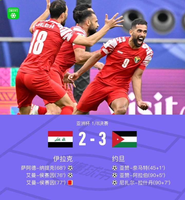 北京时间1月29日亚洲杯 1/8决赛,伊拉克对阵约旦。上半场补时阶段伊拉克队传球失误,亚赞-奈马特抢断后单刀破门。下半场伊拉克角球机会,纳提克头球扳平,随后艾曼-侯赛因后点抽射破门,之后因庆祝动作吃到第二张黄牌被罚下,补时阶段亚赞-阿拉伯补射扳平,随后拉什丹世界波绝杀,最终约旦3-2战胜伊拉克,八强将战塔吉克斯坦。