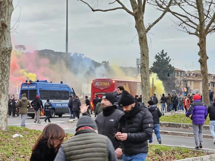 由于这也是我第一次来罗马奥林匹克球场看球,事后才知道罗马球迷和拉齐奥球迷进入球场的路线是不同的,但当时的我只能跟着导航走,就这样买了拉齐奥球票并特意穿了一件蓝色外套的我走到了罗马球迷扎堆的地方。正好罗马足球俱乐部的大巴从这里经过,这也是我在意大利之行看到的继恩波利和AC米兰后的第三辆球队大巴。不过当时的我无暇顾及球队大巴,而是担心会不会有疯狂的罗马球迷攻击我,好在虽然烟雾缭绕的现场犹如战场,罗马球迷也只是用言语来攻击拉齐奥,地上的酒瓶乒铃乓啷,大战氛围已经被渲染到了极致。