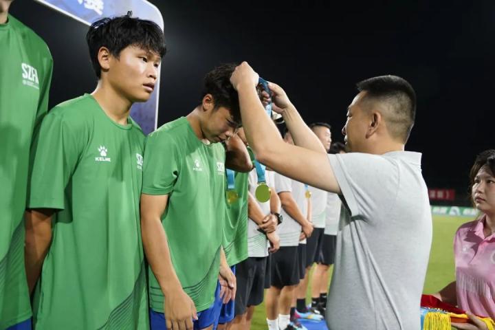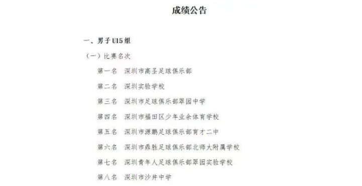 接手深圳队青训之后,深圳高圣的实力也突飞猛进。在2023中青赛深圳赛区中,深圳高圣U15居然力压深圳实验学校和翠园中学这两支强队,成功夺冠。深圳高圣也从深圳足球青训的腰部,一跃而上,站上了全深圳“青训食物链”的顶端。