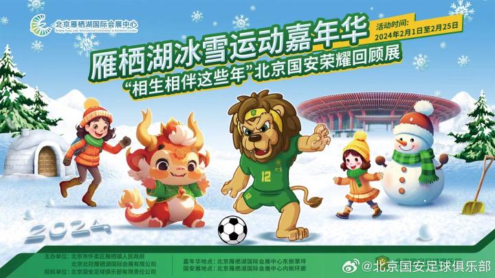 相生相伴这些年!北京国安荣耀回顾展即将举行💚💚💚北京国安足球队 @懂球帝2024-01-31 20:10相生相伴这些年!北京国安荣耀回顾展即将举行💚💚💚 2024年2月1日至25日,由北京国安足球俱乐部授权,北京市怀柔区雁栖镇人民政府、北京北控雁栖湖国际会展有限公司主办的雁栖湖冰雪嘉年华暨“相生相伴这些年”北京国安荣耀回顾展,将于北京雁栖湖国际会展中心盛大举行。 此次展览规模空前,包展开更多