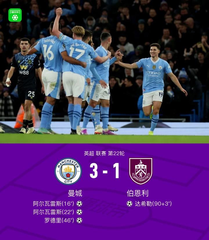 北京时间2月1日英超 联赛 第22轮,曼城主场对阵伯恩利。上半场努内斯助攻阿尔瓦雷斯破门,随后德布劳内任意球助攻阿尔瓦雷斯梅开二度,下半场罗德里闪击破门,哈兰德复出出场,达希勒补射破门扳回一球。最终曼城3-1获胜。