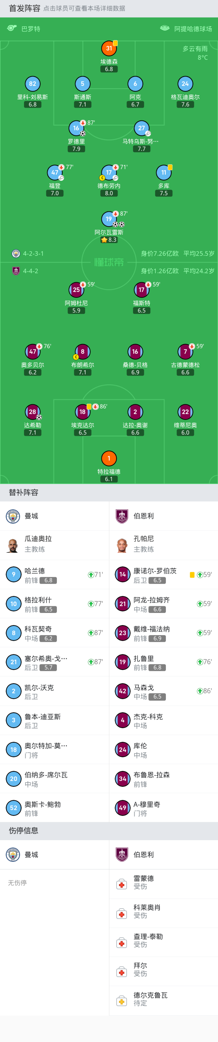 上场替补:87'8-科瓦契奇, 77'10-格拉利什, 71'9-哈兰德, 87'21-塞尔希奥-戈麦斯