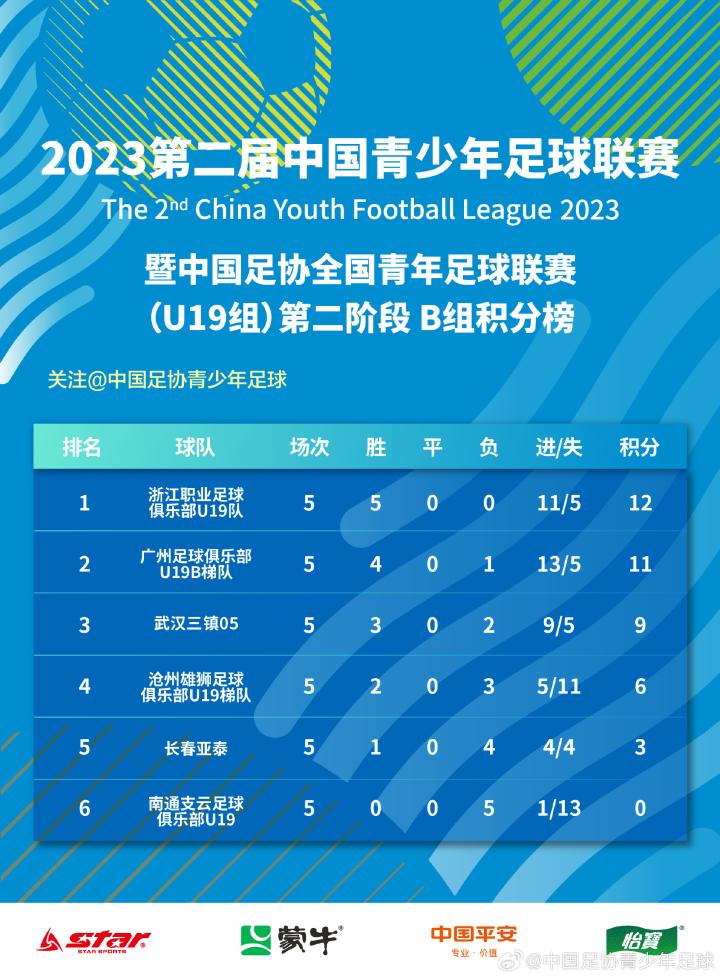 2023第二届中青赛暨“韵味杭州”中国足协全国青年足球联赛(U19组)第二阶段A/B组比赛圆满收官 :浙江职业足球俱乐部U19队、广州足球俱乐部U19B队升至A组;上海申花U19A队、上海海港足球俱乐部U19降级至B组;长春亚泰、南通支云足球俱乐部U19队降级至C组。