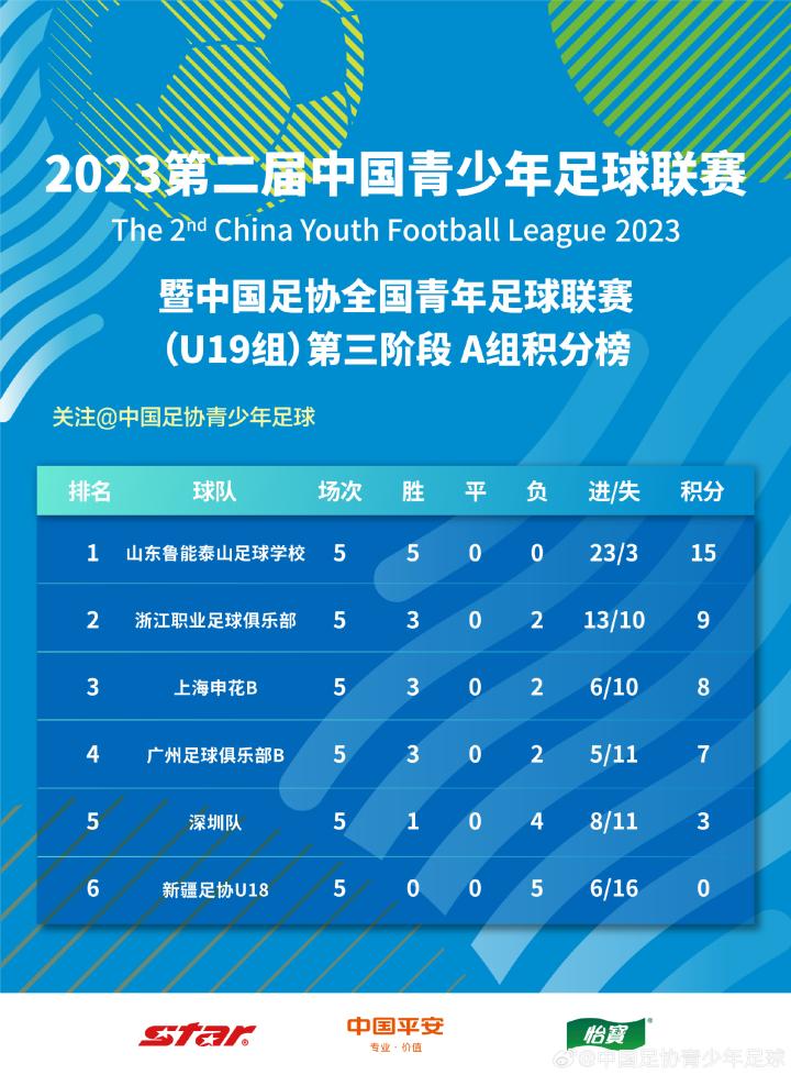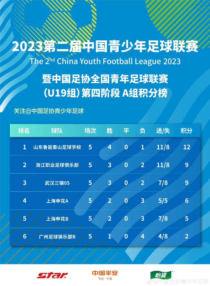 “第四阶段A组争冠组球队分别为山东鲁能泰山足球学校、浙江职业足球俱乐部、上海申花B队、广州足球俱乐部B队、武汉三镇05、上海申花A队。”