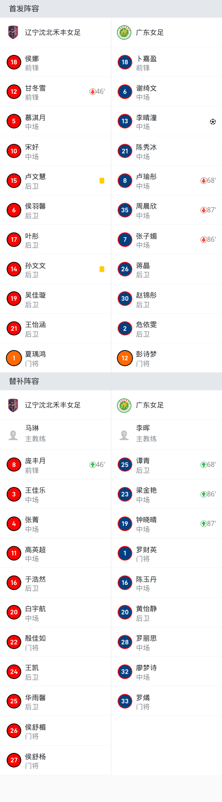广东女足首发:12-彭诗梦, 6-谢绮文, 13-李晴潼, 21-陈秀冰, 8-卢瑜彤, 26-蒋晶, 30-赵锦彤, 18-卜嘉盈, 35-周晨欣, 7-张子媚, 2-危依雯