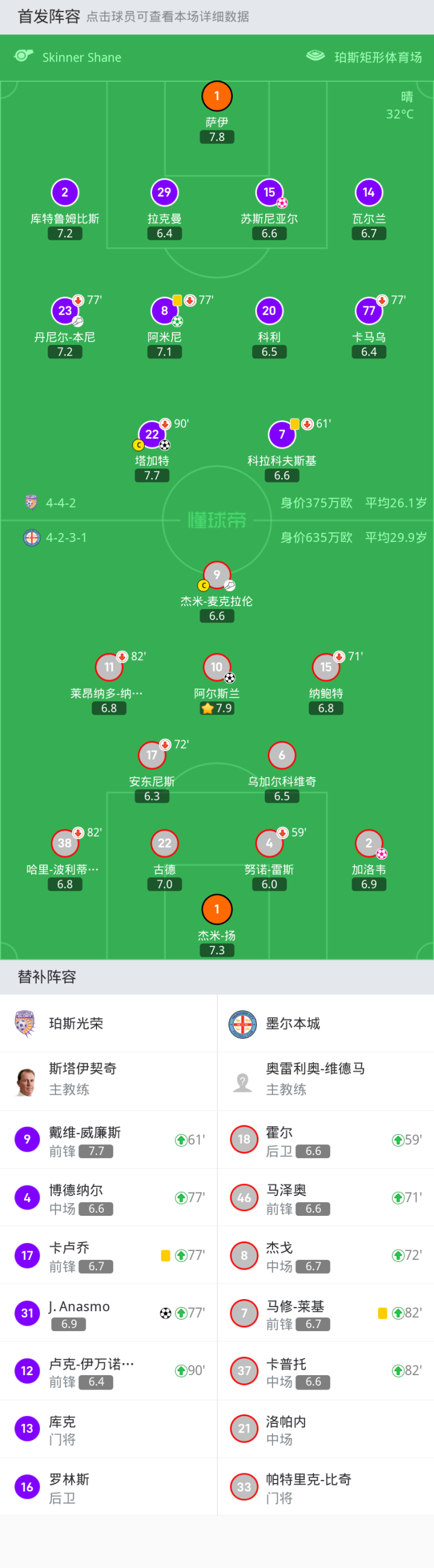 墨尔本城首发:1-杰米-扬, 10-阿尔斯兰, 4-努诺-雷斯, 17-安东尼斯, 22-古德, 15-纳鲍特, 2-加洛韦, 9-杰米-麦克拉伦, 6-乌加尔科维奇, 11-莱昂纳多-纳特尔, 38-哈里-波利蒂迪斯