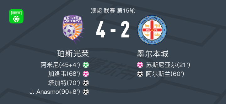 北京时间2月2日澳超 联赛 第15轮,珀斯光荣主场对阵墨尔本城。珀斯光荣阿米尼破门,塔加特破门,J. Anasmo破门,苏斯尼亚尔自摆乌龙。墨尔本城阿尔斯兰破门,加洛韦自摆乌龙。最终比分4-2。
