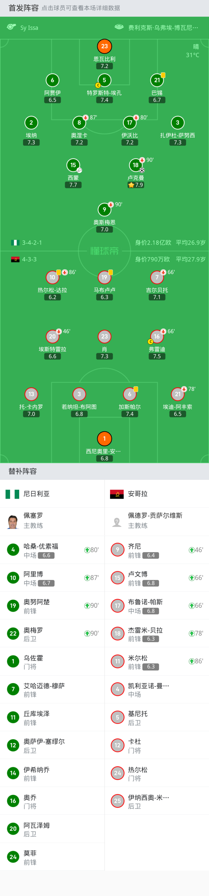 尼日利亚首发:5-特罗斯特-埃孔, 17-伊沃比, 6-阿贾伊, 2-埃纳, 15-西蒙, 9-奥斯梅恩, 18-卢克曼, 3-扎伊杜-萨努西, 8-奥涅卡, 21-巴锡, 23-恩瓦比利