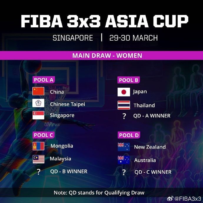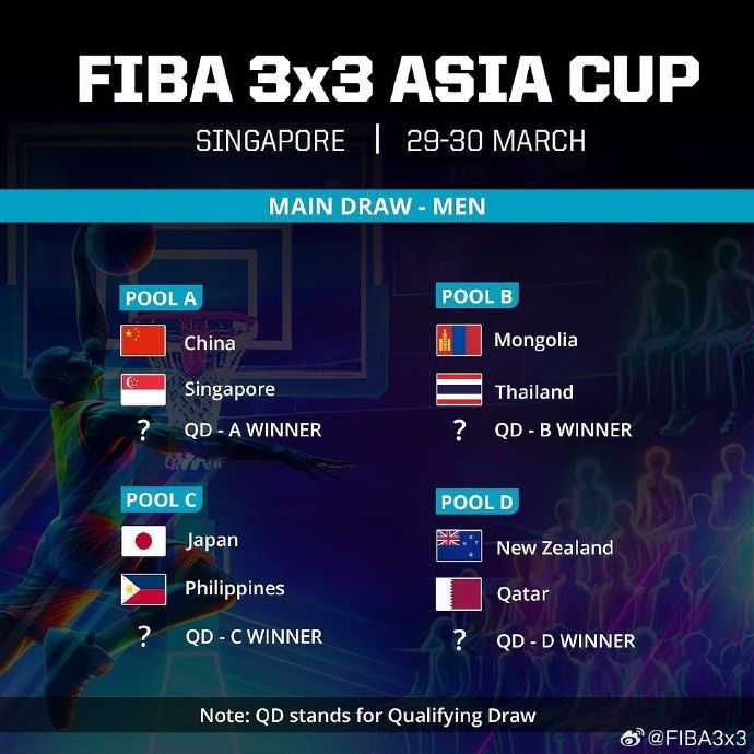 北京时间2月2日晚,FIBA3x3三人篮球亚洲杯官宣分组。中国男队与新加坡、资格赛A组胜者分在一组;中国女队与中国台北、新加坡分在一组。