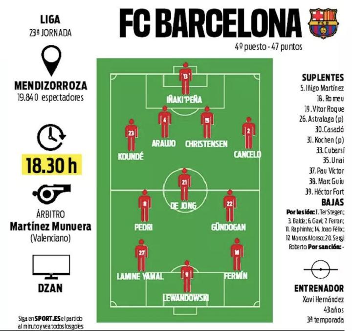 每体预测巴萨首发:莱万搭档费尔明、亚马尔,罗克替补ETChalmers @懂球帝2024-02-03 15:54西甲第23轮,巴萨将客战阿拉维斯,赛前,《每日体育报》预测巴萨此役首发,莱万搭档亚马尔、费尔明,罗克替补。报道称,唯一疑问是谁和阿劳霍搭档中卫,是保留年轻中卫库巴西还是让克里斯滕森回归首发。此外,一切都表明,费尔明将担任首发左边锋。《每日体育报》预测巴萨首发门将:伊尼亚基-佩尼亚后卫:孔德、阿劳霍、克里斯滕森、坎塞洛中场:佩德里、弗朗基-德容、京多安前锋:亚马尔、莱万、费尔明展开更多