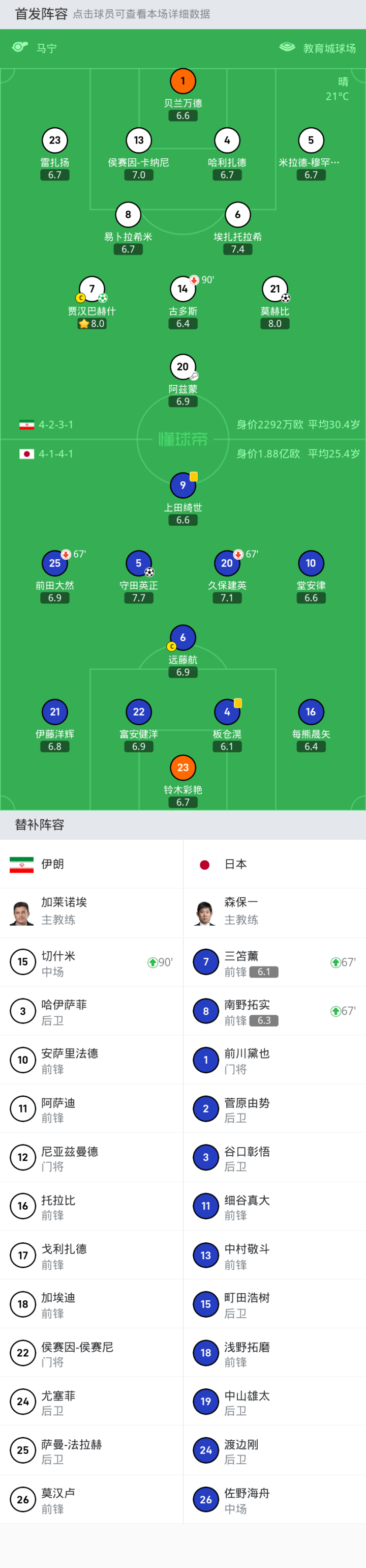 替补:3-哈伊萨菲, 10-安萨里法德, 22-侯赛因-侯赛尼, 16-托拉比, 17-戈利扎德, 12-尼亚兹曼德, 11-阿萨迪, 18-加埃迪, 25-萨曼-法拉赫, 24-尤塞菲, 26-莫汉卢