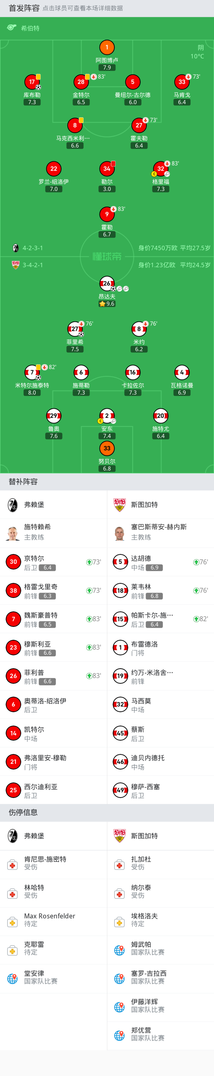 第45+10分钟,格里福角球送助攻,库布勒头球扳回一球,弗赖堡1-2斯图加特