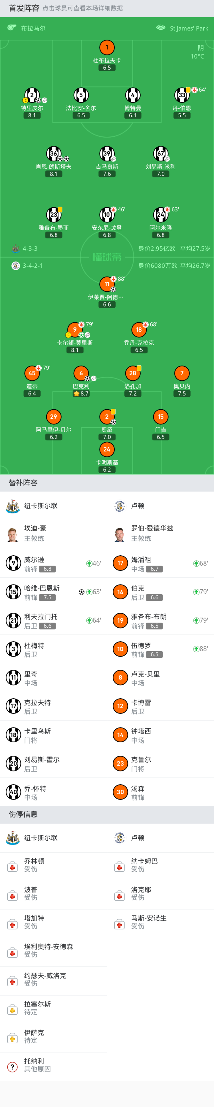 纽卡斯尔联首发:1-杜布拉夫卡, 2-特里皮尔, 5-法比安-舍尔, 33-丹-伯恩, 24-阿尔米隆, 23-雅各布-墨菲, 39-吉马良斯, 36-肖恩-朗斯塔夫, 10-安东尼-戈登, 4-博特曼, 67-刘易斯-米利