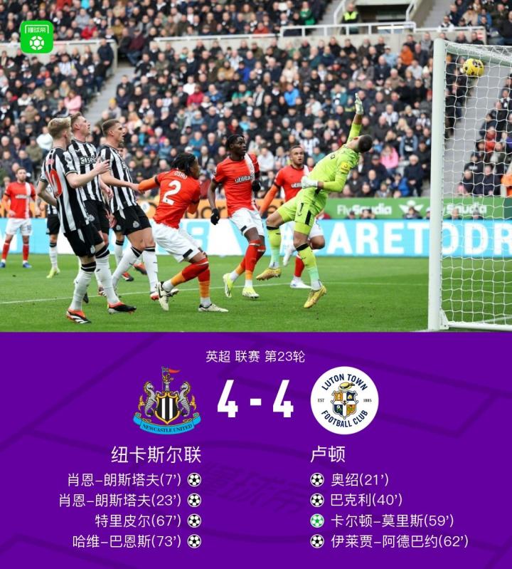 纽卡斯尔联4-4卢顿,朗斯塔夫梅开二度,特里皮尔传射建功